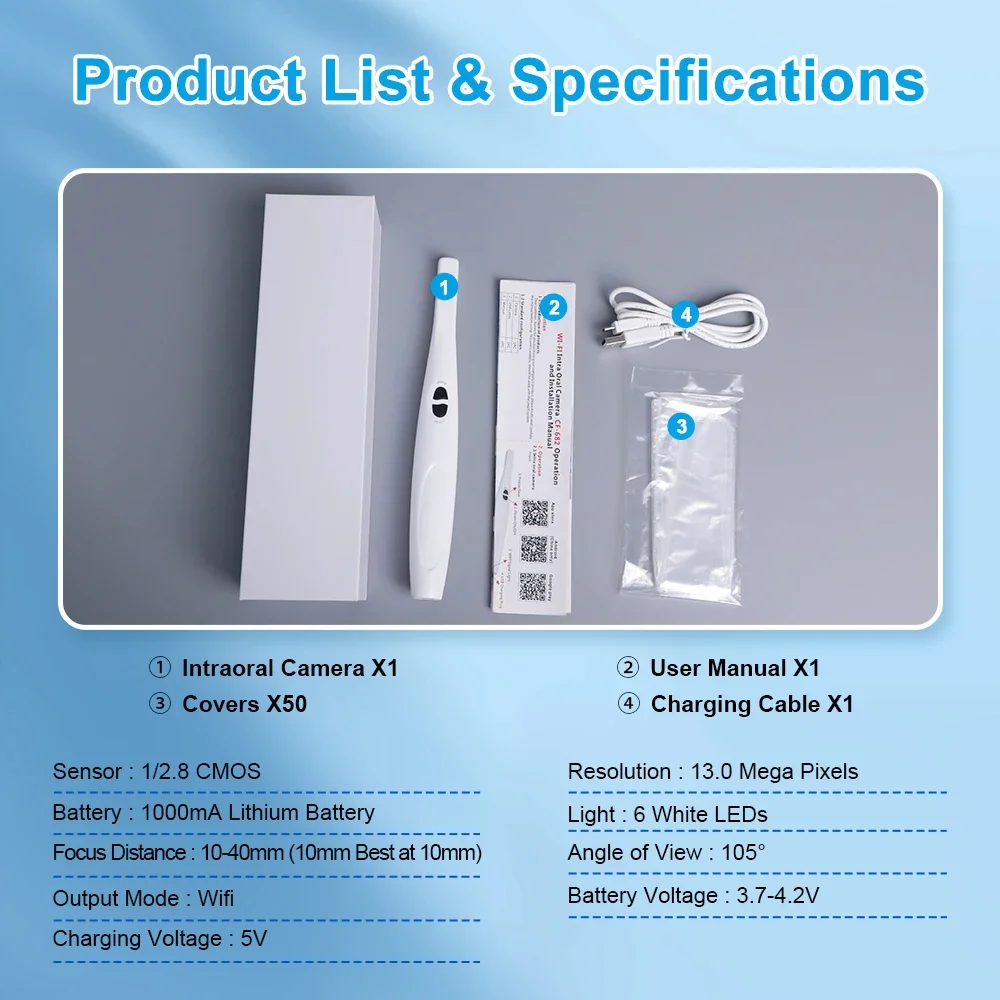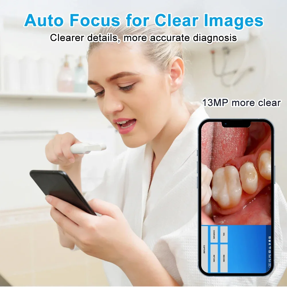 Looking for a high-resolution, auto-focus intraoral camera to enhance your dental practice? Our 13 Megapixel Dental Intraoral Camera is designed to provide 1080P HD images, ensuring precise diagnostics with every detail captured. This wireless intraoral camera supports WiFi connection and is compatible with Android, iOS, and Windows devices, giving you the flexibility to view images anytime and anywhere.